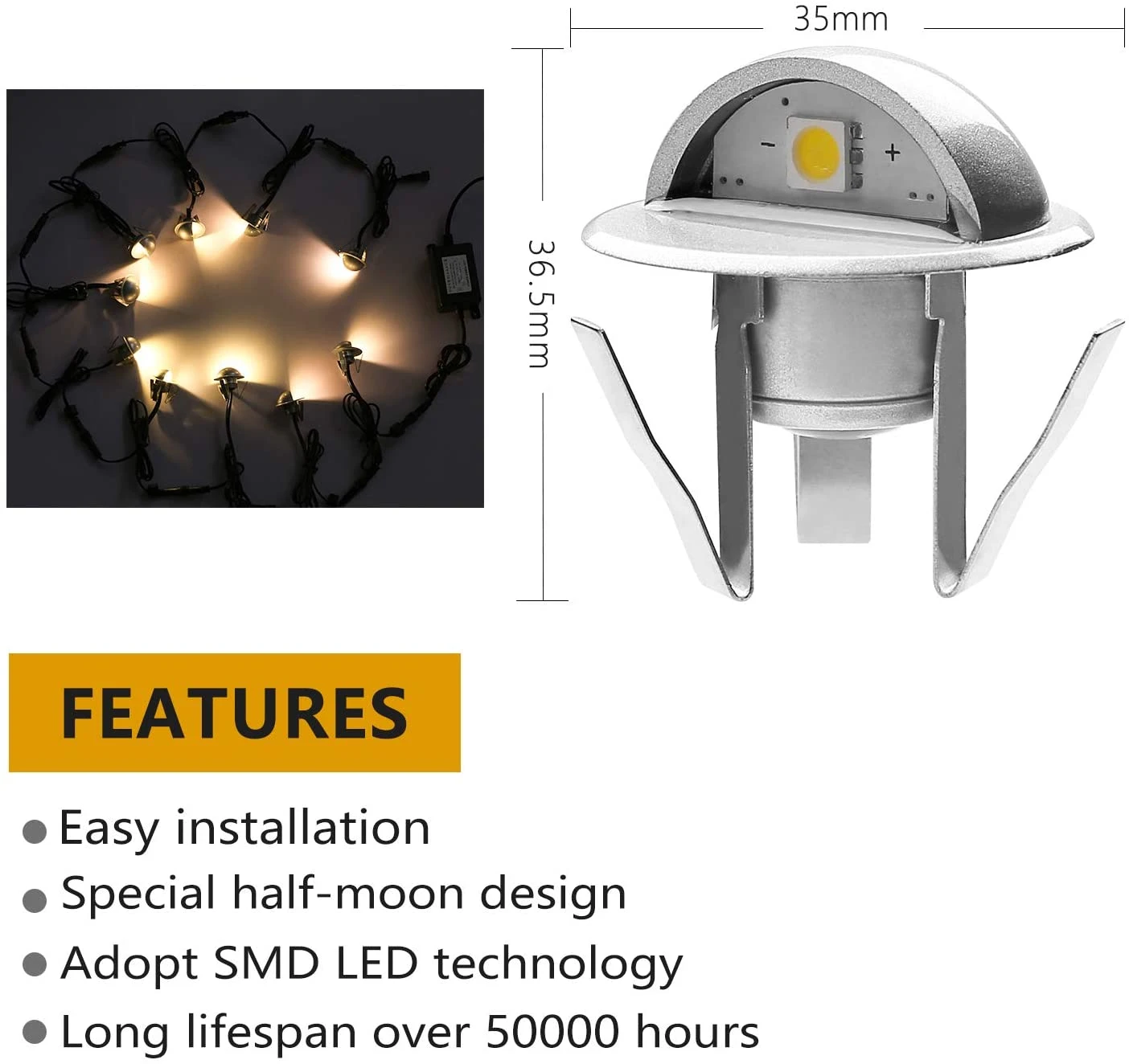 LED Step Lights Low Voltage IP67 Waterproof Recessed LED Deck Lighting, Half Moon F1.38"Specification:*Model: LF-B106* Beam angle: 90°* Lumen Output: 10 Lm* Lighting Color: Warm White* Light Color Temperature: 2800-3200K* Output Power Rate for Each Bulb: 0.4W*